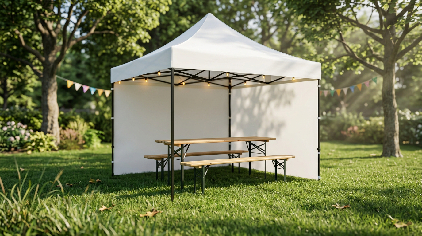 La evenimentele în aer liber se utilizează frecvent cortul de grădină pliabil tip foarfecă, care oferă protecție împotriva soarelui și a vremii nefavorabile. În combinație cu seturile de bere din lemn, creează o zonă confortabilă și practică pentru invitați.