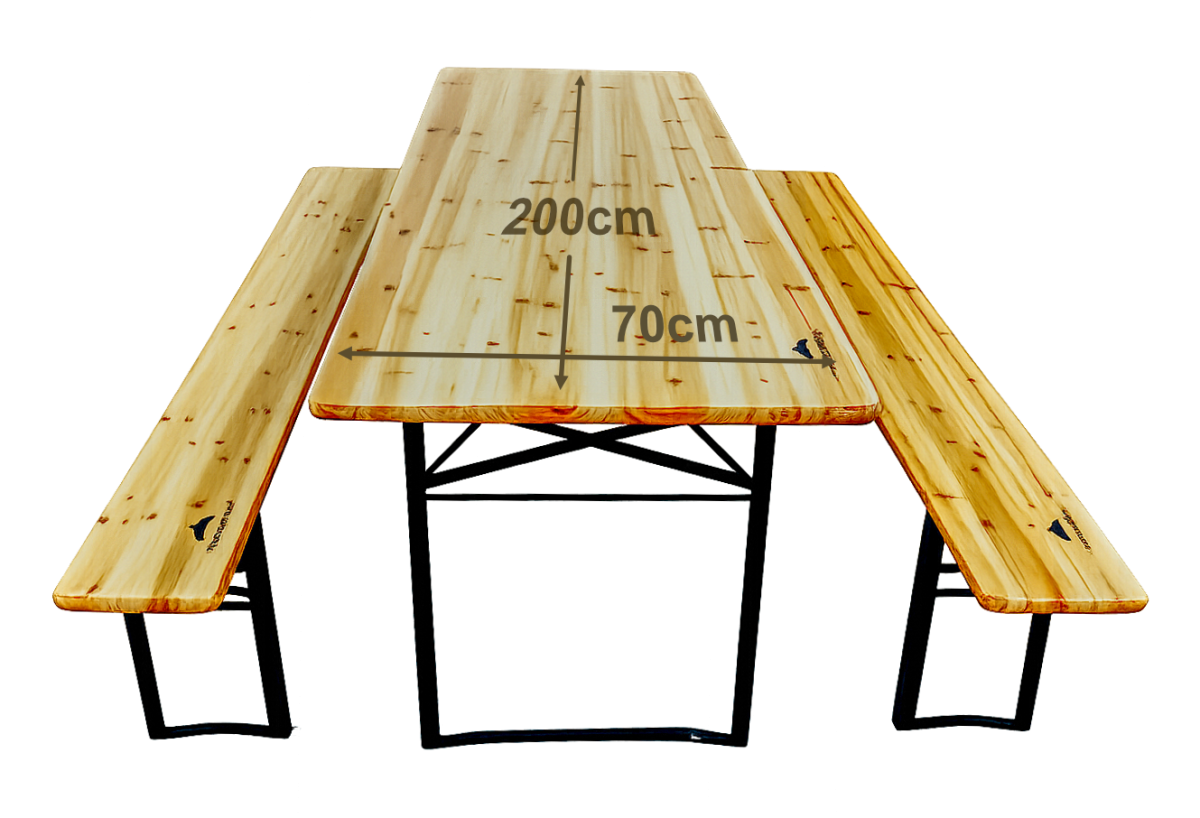 Set de bere robust din lemn, cu lungimea de 200 cm și două bănci, realizat din cireș japonez. Suprafața lăcuită oferă rezistență sporită la condițiile meteorologice. Masa este disponibilă cu lățime de 50 sau 70 cm – soluția ideală pentru grădini, unități HoReCa și evenimente. Mai multe informații