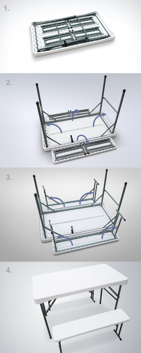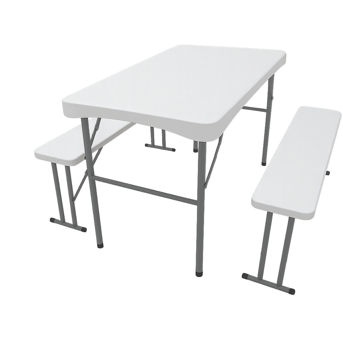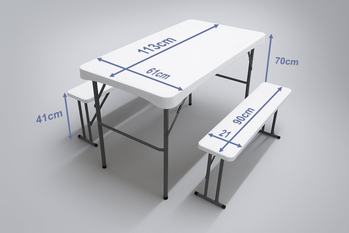 Datorită designului ingenios tip „geantă”, setul se pliază ușor: băncile se pot depozita în interiorul mesei, transformând întregul set într-o valiză compactă cu mâner. Nu ocupă aproape deloc spațiu în mașină, garaj sau pivniță — lucru pe care îl vei aprecia la fiecare transport sau depozitare.